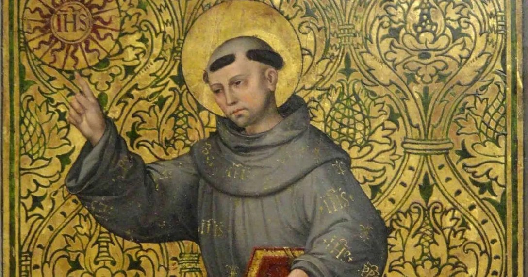 Den helige Bernardino av Siena som vi firar idag förres i Massa Marittima i Toscana i Italien år 1380. Han inträdde i franciskanorden, prästvigdes och blev en av medeltidens största folkpredikanter, som genomkorsade Italien under många predikoresor. Han utbredde framförallt vördnaden för Jesu heliga namn. I en predikan sade han: “Jesu namn är förkunnarnas glans, eftersom det med sin lysande glans låter hans ord bli förkunnat och mottaget. Hur tror du att trons ljus så överväldigande och så snabbt kunde spridas i världen, utom genom förkunnelsen av Jesus? Är det inte genom ljuset och smaken i detta namn som Gud har kallat oss till sitt underbara ljus?” (Sermo 49, dagens läsningsgudstjänst)